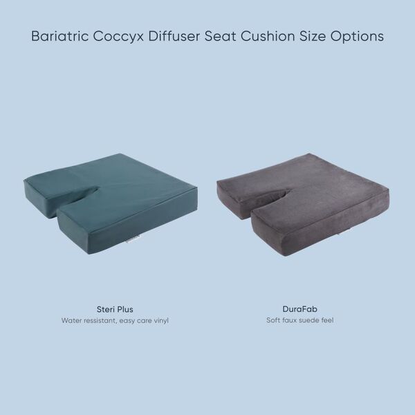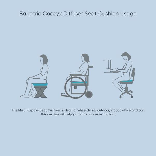 Ease coccyx discomfort with our Diffuser Coccyx Cushion - Bariatric. Featuring a 10cm thick foam with a tailbone cut-out, it supports larger frames and reduces pressure. Orthopedically designed, it relieves coccyx pain and soreness, ideal for extended sitting. Choose from two covers for easy cleaning and enjoy comfort and support all day.