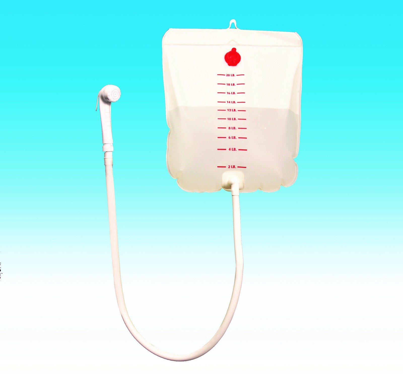 The water bag shower set is a practical bedside shower that can be hung on either a bed post or IV stand via a hook. The hose has an on/off switch so that the user has full control of the water flow.